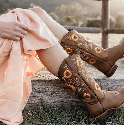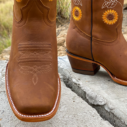 Hello Sunflower... Or should I say the "Happy Flower" because I'm pretty sure these cowgirl boots made you smile.  This is a classic snip toe cowgirl boot, perfect for your country outings having fun, date nights, or country weddings. It features a gorgeous embroidered Girasol design, butter-soft smooth teal pig lining, and a traditional leather insole. Just like a sunflower, you'll sure stand out from the crowd.